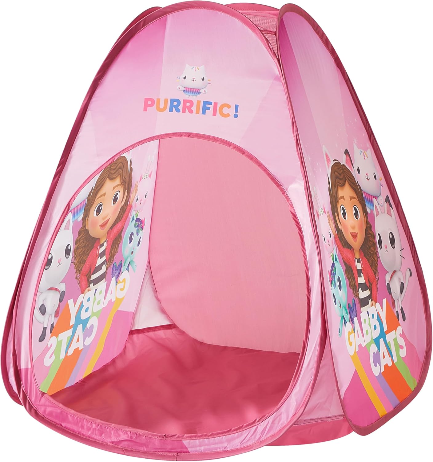 - DISEÑO: Divertidos y brillantes gráficos de Gabbys Dollhouse están impresos en esta tienda de campaña Pop Up Play para niños. Con un tejido de nailon transpirable que se puede atar, esta tienda de campaña es perfecta para que los niños pequeños jueguen, se relajen y para crear un espacio personal. El escape perfecto para todos los súper fanáticos de Gabbys Dollhouse.