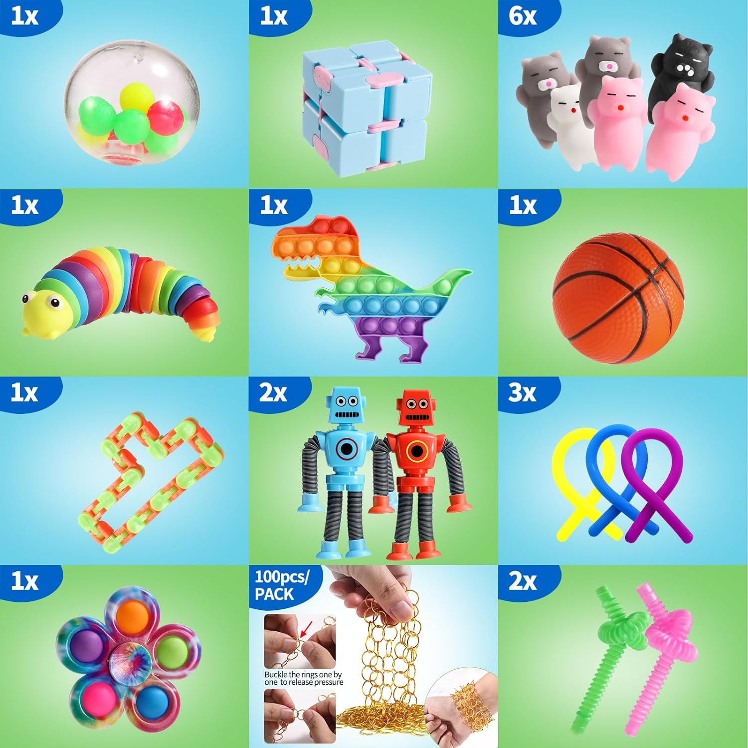 - Los juguetes antiestrés incluyen anillos de salto en una bolsa que se pueden unir para hacer una cadena, juguetes sensoriales diseñados específicamente para niños con autismo, utilizados en sesiones de terapia y para calmar las mentes de los niños autistas, desarrollar habilidades prácticas. Juguetes sensoriales regalos para todas las edades, también son maravillosos incentivos y premios para niños