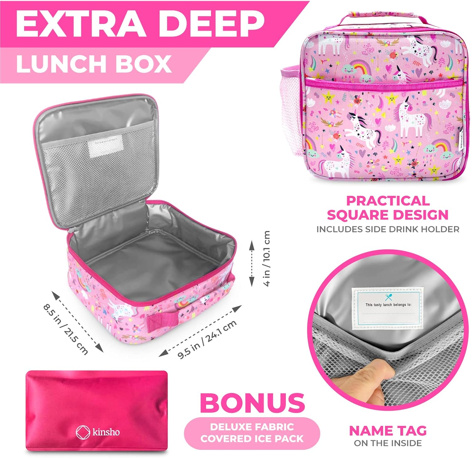• Compartimento extra profundo y espacioso para guardar el almuerzo, aperitivos y una bebida. El bolsillo frontal tiene una cremallera resistente con lengüeta colorida. Bolsillo interior de malla para utensilios, etc. 9.5 x 8.5 x 4 pulgadas.