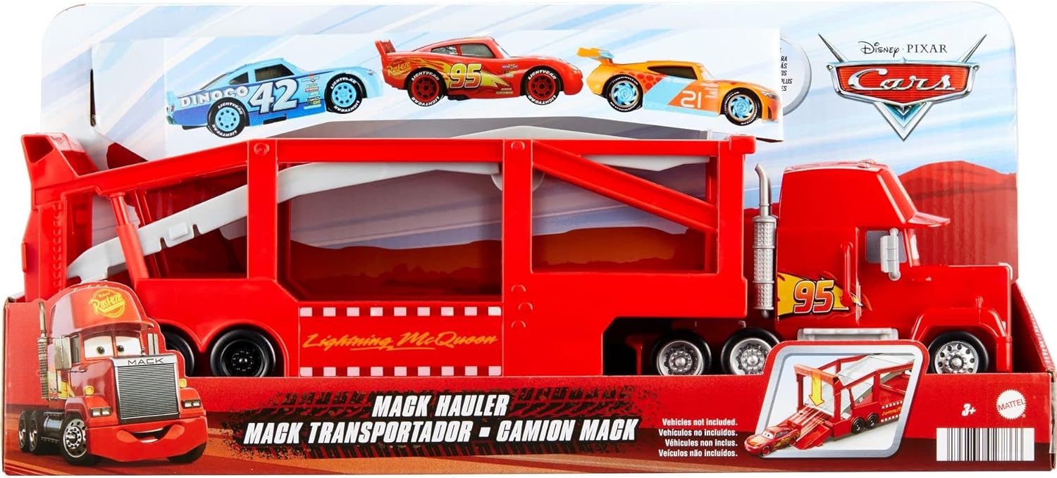 Mattel Disney and Pixar Cars Mack Hauler, camión transportador de juguetes de 13 pulgadas con rampa y almacenamiento de transporte para 12 vehículos