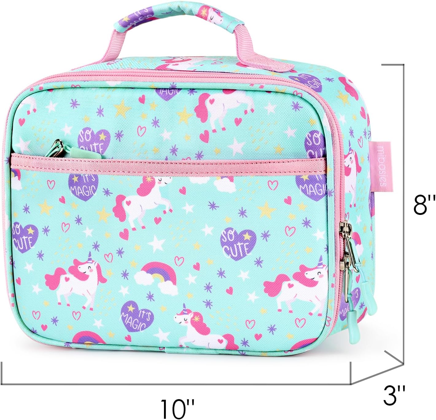 - Multifuncional y espaciosa: esta lonchera para niños mide 10 x 3 x 8 pulgadas. Es compatible con la mayoría de las loncheras favoritas de Estados Unidos. El práctico bolsillo frontal con cremallera ofrece espacio adicional para condimentos y servilletas. El bolsillo interno de malla con cremallera es ideal para guardar paquetes de hielo, cuchillos, tenedores y cucharas.