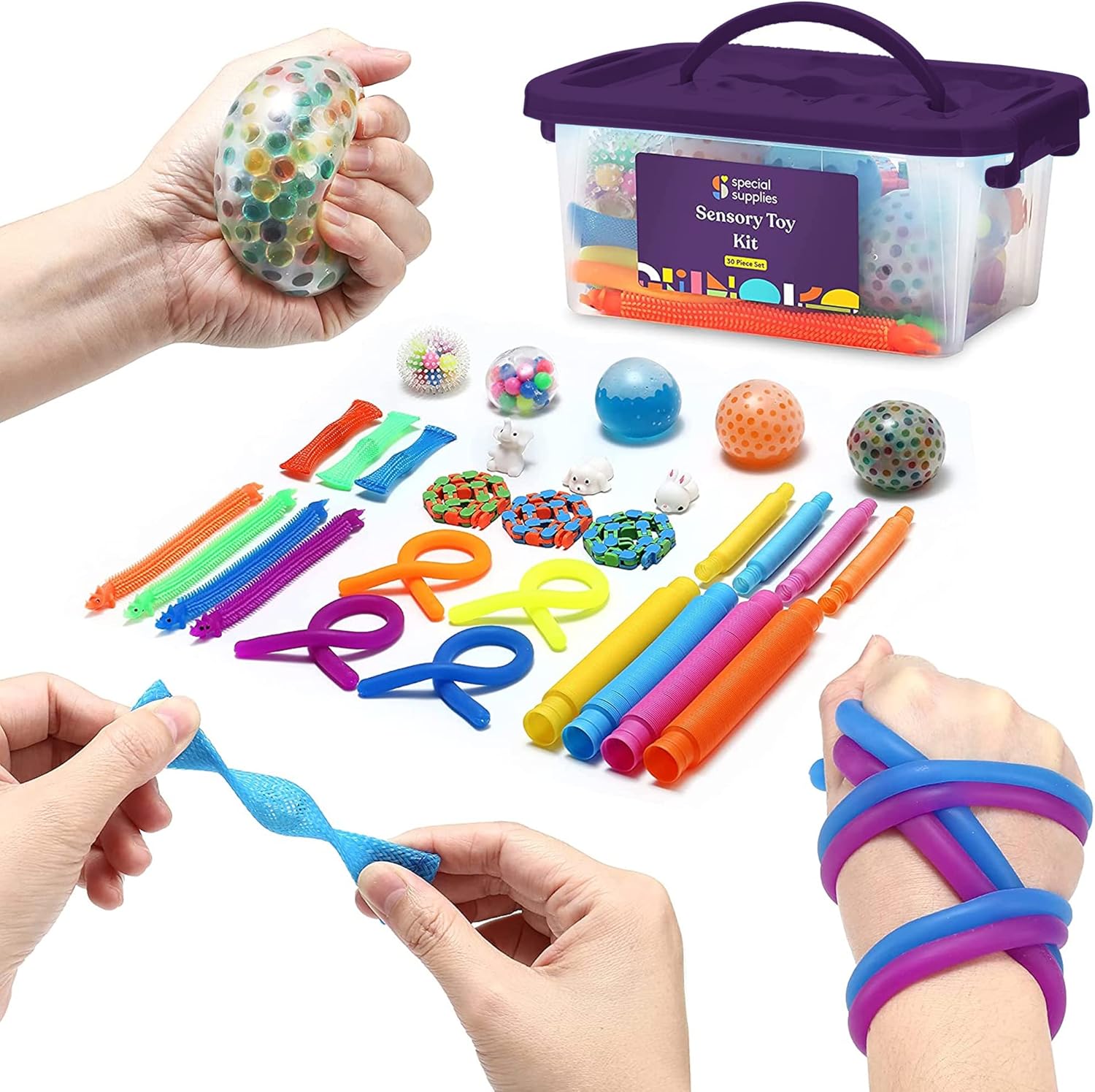 - Paquete de juguetes sensoriales interactivos: este emocionante paquete de juguetes para ansiedad para niños viene con 30 juguetes individuales con los que les encantará jugar, incluyendo cuerdas elásticas, juguetes para ansiedad de mármol, bolas esponjosas, tubos mini y grandes, pequeñas mascotas esponjosas, pistas antiestrés y mucho más.