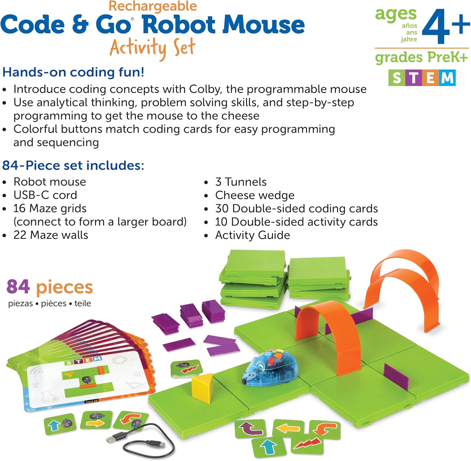 - Set de actividades de lujo! : Este juego de codificación incluye 16 rejillas de laberinto que crean un 20" X 20", 22 paredes de laberinto, 3 túneles, 30 tarjetas de codificación de doble cara, 10 tarjetas de actividad de doble cara, cuña de queso y guía de actividades para proporcionar una introducción práctica a los conceptos de codificación.