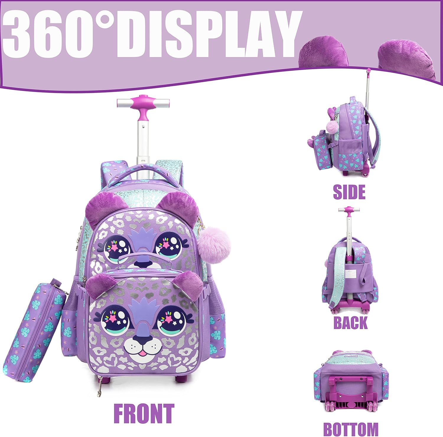 Tamaño de la mochila rodante para niñas: 16.5 x 11.8 x 7 pulgadas. Caja de almuerzo: 9 x 8 x 4 pulgadas. Estuche para lápices: 9 pulgadas